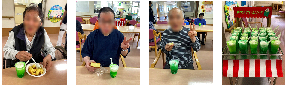 この日のおやつはメロンクリームソーダとカステラ。皆さん美味しそうに召し上がられました♪