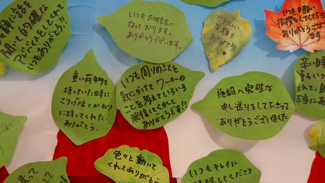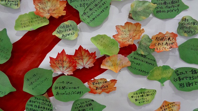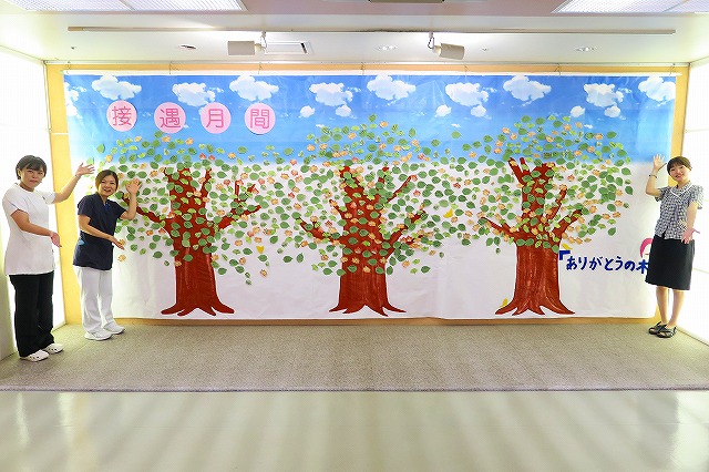 9月の接遇月間の新たな企画として「ありがとうの木」を作りました。職員、万成病院に関わる全ての人に日頃の感謝の気持ち、思いを表現してもらい伝えることを目的としました。木の葉を模倣したメッセージカードへそれぞれの感謝の気持ち、思いを心込めて書き込みました。これを3本の大きな木に貼り付け、全職員参加の手作りの「ありがとうの木」が完成されました。玄関ロビーに展示しています。